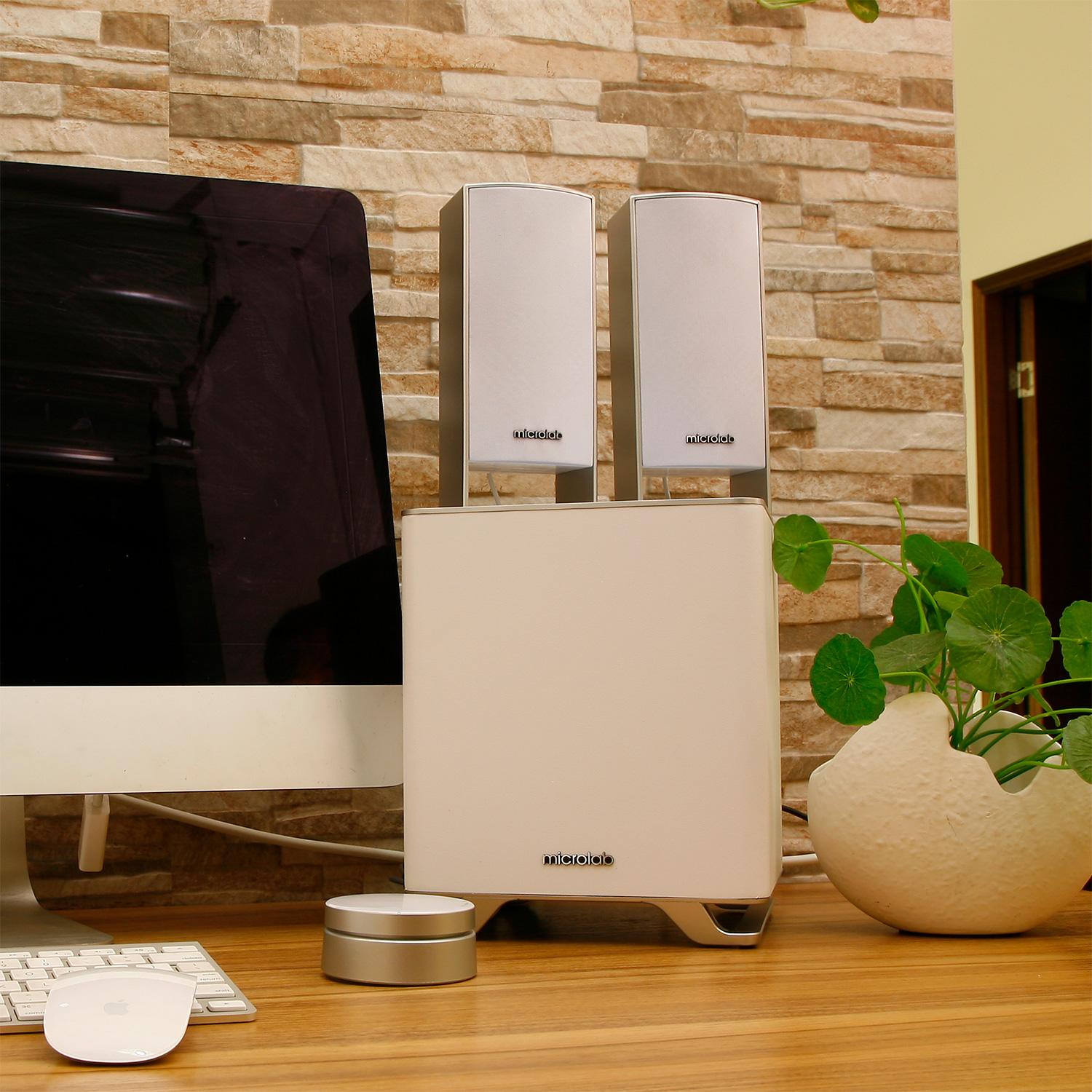 M-600BT is a 2.1 multimedia speaker system with Bluetooth, easily connecting to your phones and Bluetooth-enabled devices. The wooden subwoofer is covered with black leather finishes and the satellites are designed with cloth net.